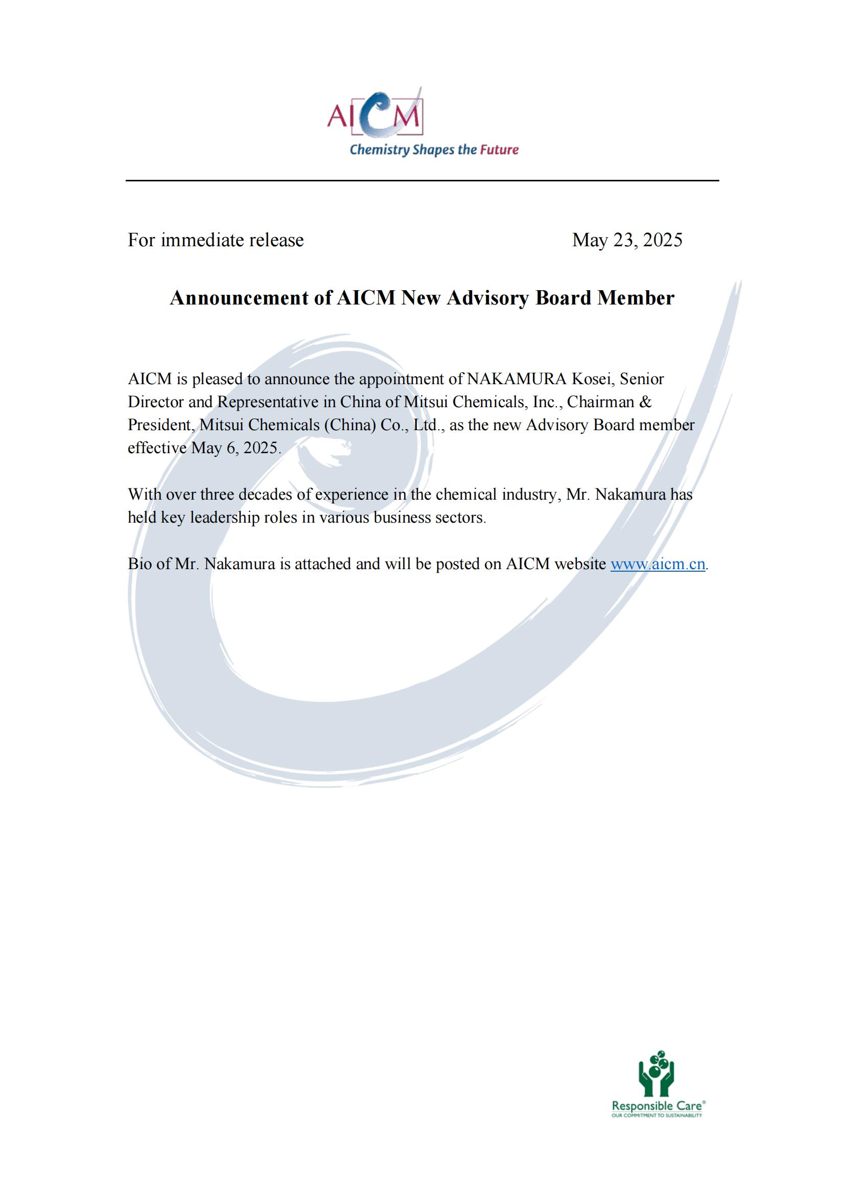 Abstract:AICM is pleased to announce the appointment of NAKAMURA Kosei, Senior Director and Representative in China of Mitsui Chemicals, Inc., Chairman & President, Mitsui Chemicals (China) Co., Ltd., as the new Advisory Board member effective May 6, 2025.